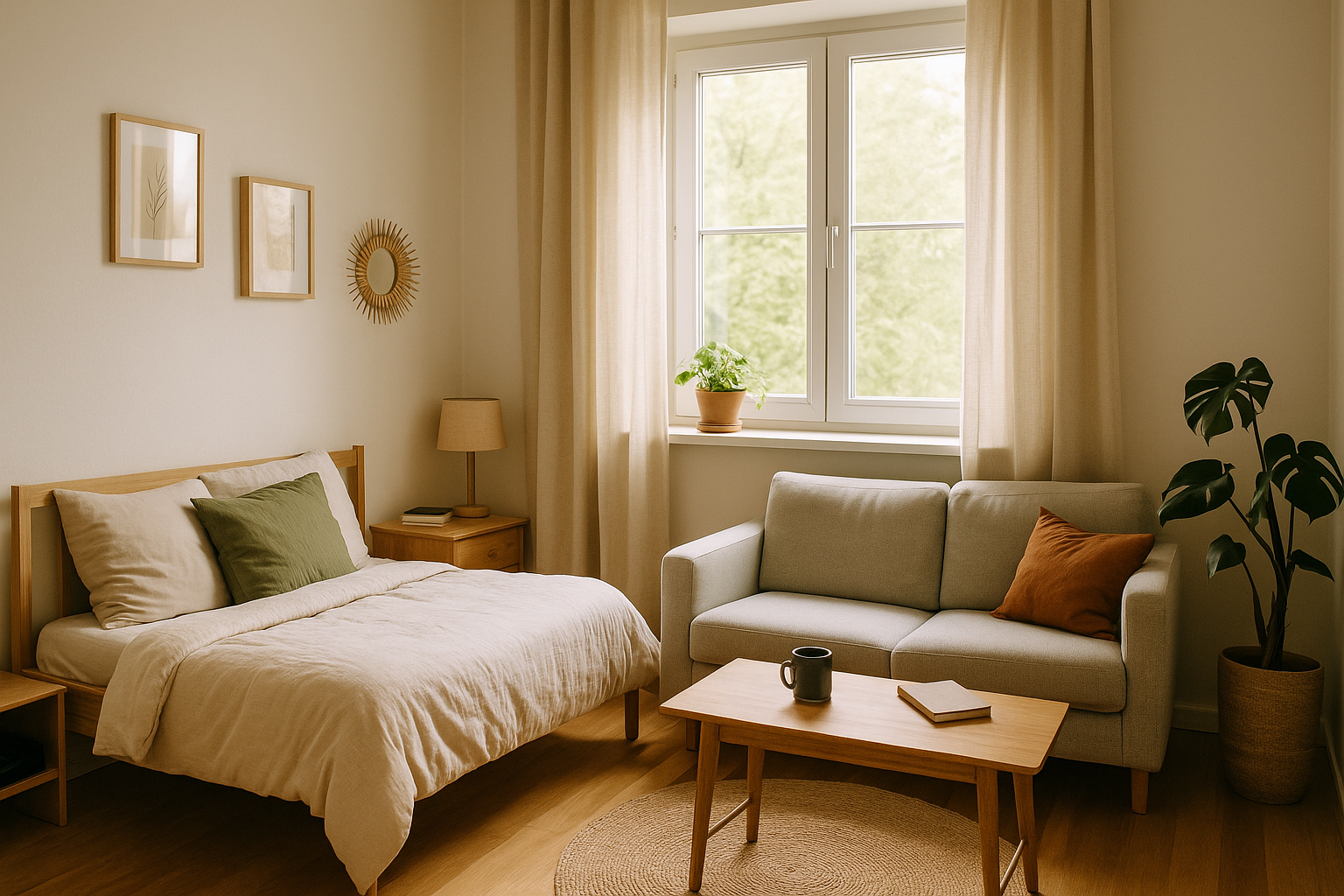 침실, 주방, 거실이 따로 없는 구조를 실용적으로 구분하려면, 가구를 활용해 ‘공간을 나누는’ 배치를 시도해 보세요.